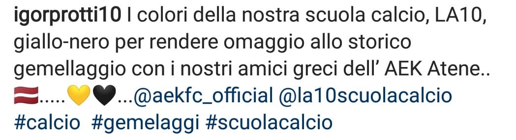 Συγκεκριμένα ο πρώην επιθετικός της Λιβόρνο Ιγκόρ Πρότι, άνοιξε τη δική του ακαδημία ποδοσφαίρου και τα χρώματα που της έδωσε είναι το κίτρινο και το μαύρο λόγω της ΑΕΚ. Μάλιστα ο ίδιος έκανε ιδιαίτερη αναφορά στον προσωπικό του λογαριασμό στο instagram αναφέροντας: «Τα χρώματα της ποδοσφαιρικής μας σχολής, LA 10, είναι το κίτρινο και το μαύρο για να τιμήσουμε την ιστορική αδελφοποίηση με τους Έλληνες φίλους μας από την ΑΕΚ»
