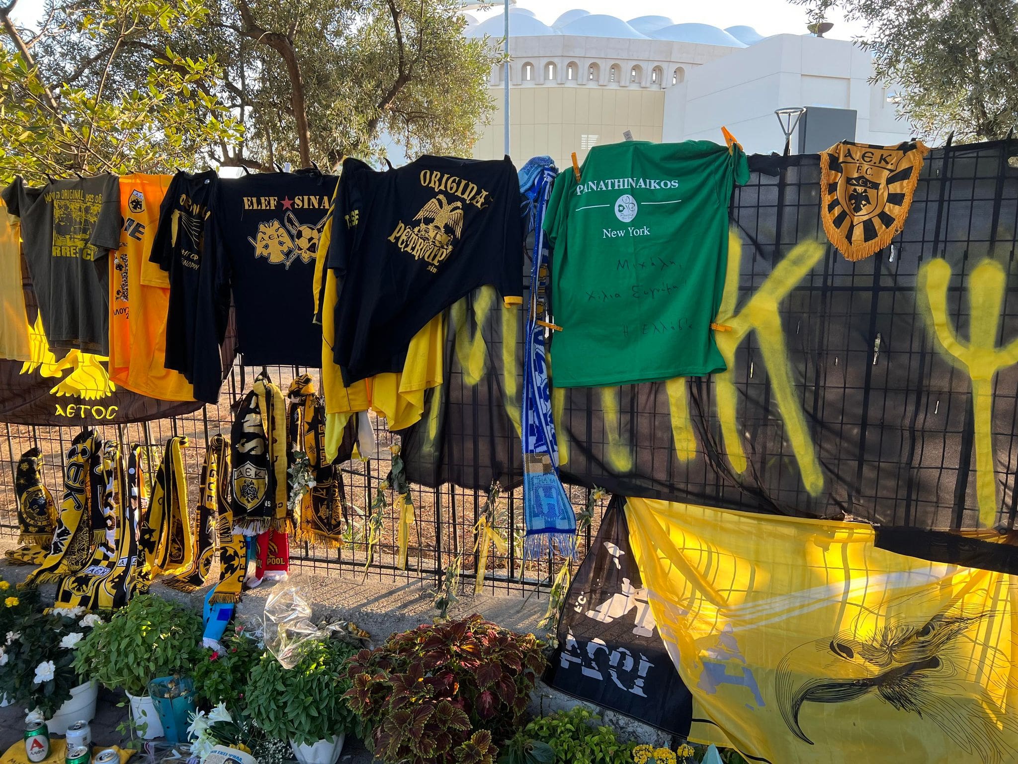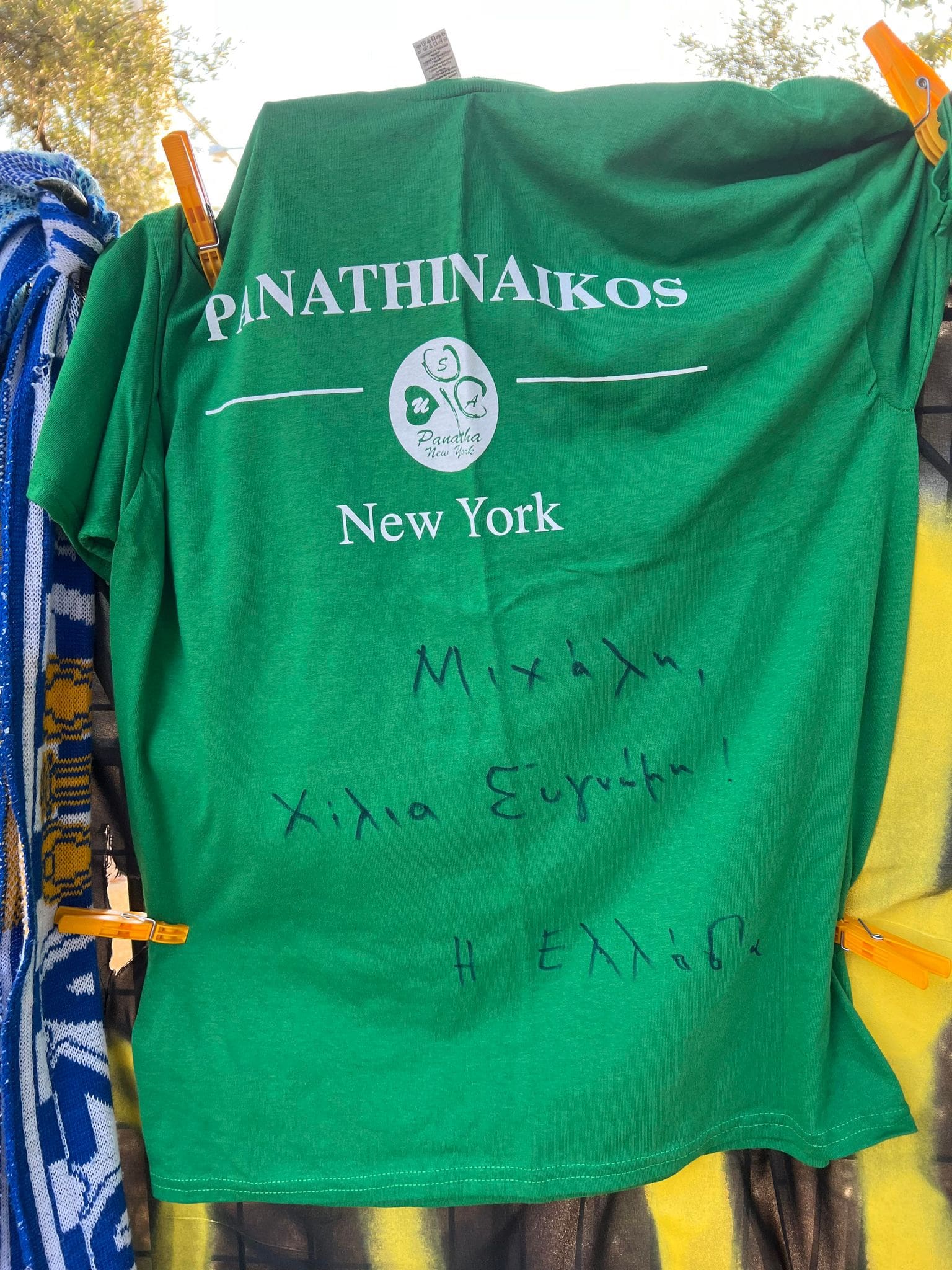 Σε μια κίνηση που βάζει τα γυαλιά στους εδώ Παναθηναϊκούς, οι φίλοι των πρασίνων από τη Νέα Υόρκη, επισκέφθηκαν τον τόπο που άφησε την τελευταία του πνοή ο Μιχάλης. Ο Σύνδεσμος του Παναθηναϊκού στην Αμερική, αφιέρωσε μια πράσινη μπλούζα στο Μιχάλη μας, γράφοντας πάνω συγγνώμη… και υπογράφοντας από κάτω “Η Ελλάδα”. Συγκλονιστικό…
