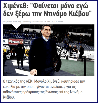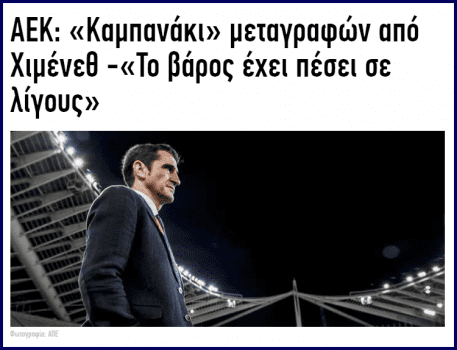 - Η ΑΕΚ είναι δεύτερη στο τέλος του πρώτου γύρου, με ένα βαθμό πίσω από τον πρώτο και βρίσκεται στους 32 του Γιουρόπα αήττητη, χάρη στα εγκλήματα του Χιμένεθ. Αν είχε έναν καλύτερο προπονητή θα είχε διαχειριστεί καλύτερα τα εκατομμύρια που έχουν δαπανηθεί και θα ήμασταν τώρα 10 βαθμούς μπροστά έχοντας κάνει 5-6 νίκες στην Ευρώπη.