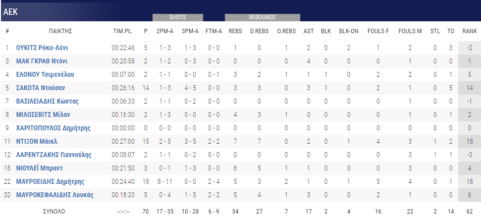 Από την πλευρά της ΑΕΚ, ο αρχηγός Ντούσαν Σάκοτα, ο Μάικλ Ντίξον και φυσικά ο Δημήτρης Μαυροειδής ήταν αυτοί που έσυραν τον χορό. Στα αρνητικά, ωστόσο, πέρασε η κακή εμφάνιση τόσο του Ούκιτς όσο και του Μαυροκεφαλίδη, δύο παικτών που θα μπορούσαν να πάρουν στους ώμους τους την ΑΕΚ σε άλλους αγώνες.