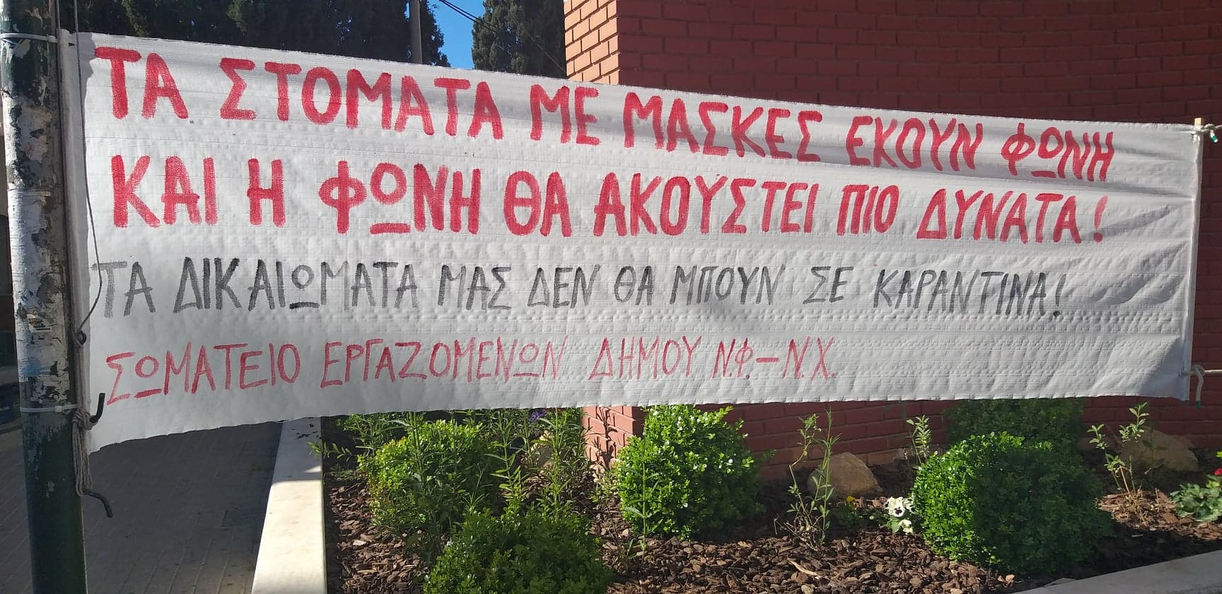 Το Σωματείο Εργαζομένων του Δήμου Φιλαδέλφειας – Χαλκηδόνας, με δυο διαφορετικά πανό, περνά δυο διαφορετικά μήνυμα… Για τους εργαζόμενους που έχουν λαλιά και δεν υποκύπτουν στις άγριες διαθέσεις της εξουσίας (όποιας μορφής…) και για την πανδημία που φαίνεται πως αποτελεί το καλύτερο όπλο για κάποιους… για την συντριπτική καταπάτηση των εργασιακών δικαιωμάτων και κεκτημένων. Μπράβο παιδιά. Μαζί σας…