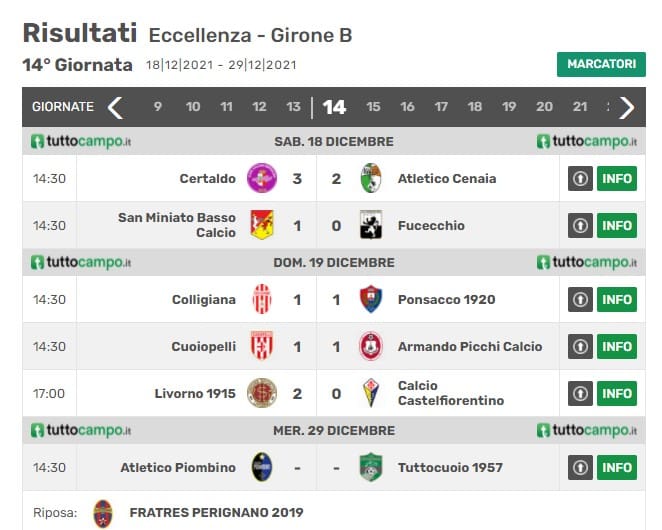 Συνοπτικά τα αποτελέσματα της 14ης αγωνιστικής του τοπικού πρωταθλήματος της Τοσκάνης