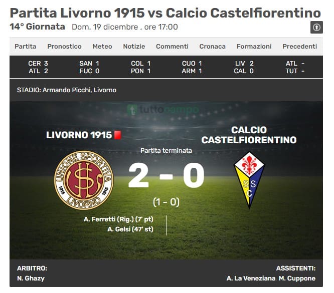 Μεγάλη νίκη με 2-0 πέτυχε η Λιβόρνο στο πλαίσιο της 14ης αγωνιστικής του τοπικού πρωταθλήματος της Τοσκάνης. Οι Λιβρονέζοι επιβλήθηκαν εντός έδρας της Calcio Castelfiorentino, χάρη σε τέρματα που πέτυχαν ο Φερέτι στο 7′ και ο Γκέλσι στην εκπνοή του αγώνα.
