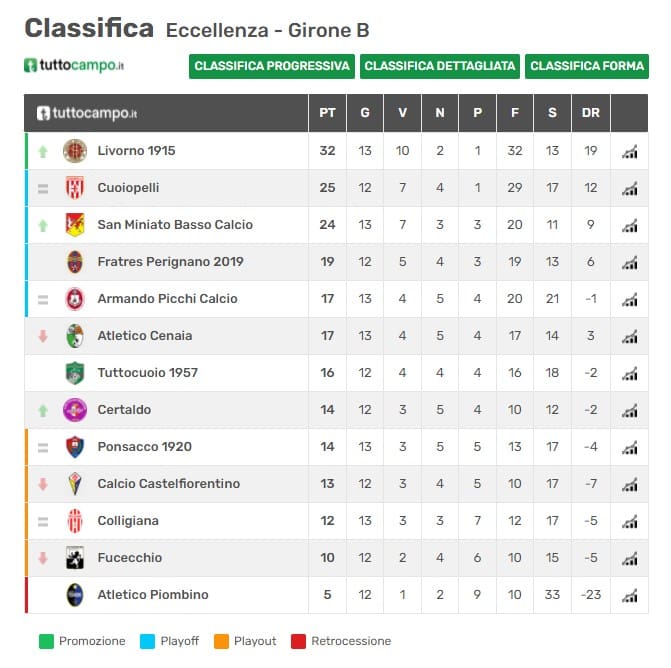 Στη βαθμολογία η Λιβόρνο έχει ξεφύγει πλέον επτά βαθμούς και φαίνεται πως θα κάνει περίπατο μέχρι την κατάκτηση του τίτλου! Η δεύτερη Cuoiopelli που έχει και έναν αγώνα λιγότερο κόλλησε σε ισοπαλία 1-1 εντός έδρας με την Armando Picchi Calcio που είναι 5η στον βαθμολογικό πίνακα. Η San Mnato Basso Calcio αναρριχήθηκε στην 3η θέση κερδίζοντας στο γήπεδο της την Fucecchio με 1-0. Η Frates Perignano 2019 έμεινε στην 4η θέση, αφού είχε ρεπό.
