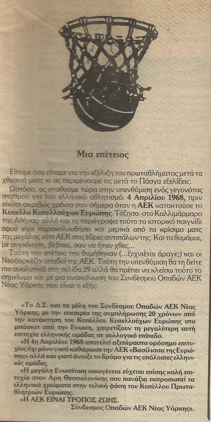 Για να μαθαίνουν οι νεότεροι και να θυμούνται οι πιο παλιοί, ανήμερα της επετείου για την συμπλήρωση 20 χρόνων από την στέψη της ΑΕΚ ως Βασίλισσας της Ευρώπης, στείλαμε σχετική ανακοίνωση στον ομογενειακό τύπο. Η εφημερίδα “Πρωινή” που μας πήγαινε με τα μπούνια γιατί γούσταρε την τρέλα μας, δημοσίευσε την ανακοίνωση μαζί με το σχετικό σχόλιο