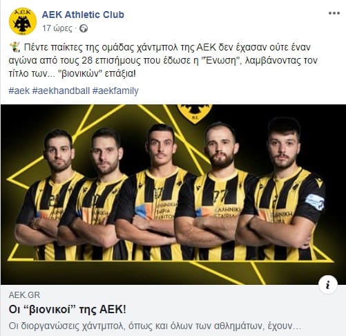 Ακολουθώντας το link που έχει ανεβάσει η ΑΕΚ στην σελίδα της στο Facebook, με αφιέρωμα για το Χάντμπολ, πέφτεις στο κενό… λόγω ανανέωσης σελίδας… Μήπως θα έπρεπε το κείμενο που είχε ανέβει πριν λίγες ώρες να έχει “σωθεί” και να παρουσιάζεται στη σελίδα στο FB; Απλή λογική…