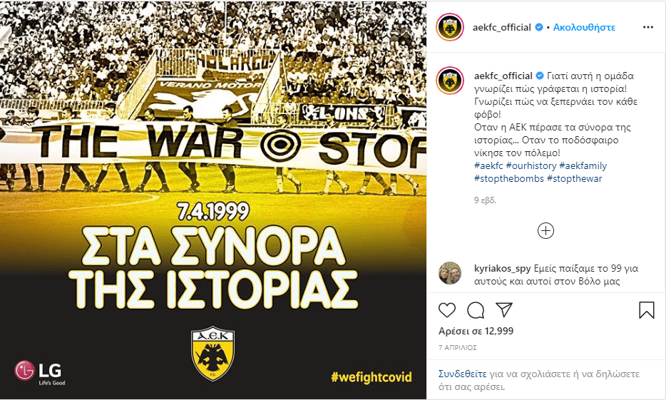 Ανάρτηση της ΠΑΕ ΑΕΚ με αφορμή την επέτειο από το ταξίδι που αποτέλεσε την κορυφή των αντιϊμπεριαλιστικών δράσεων στον χώρο του αθλητισμού ενάντια στον πόλεμο που έκανε το ΝΑΤΟ στην Γιουγκοσλαβία