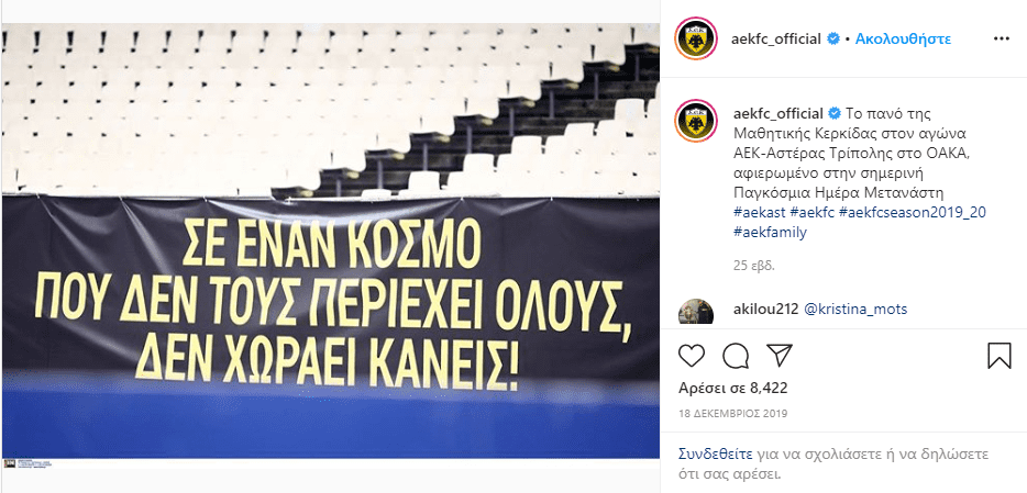 Μήνυμα της ΠΑΕ ΑΕΚ απέναντι στον ρατσισμό.Ανακοινώσεις και δράσεις της επίσημης ΑΕΚ για το ζήτημα των προσφύγων