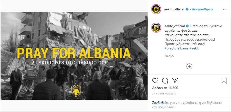 Μήνυμα αλληλεγγύης στον Αλβανικό λαό που δοκιμάστηκε από φονικούς σεισμούς