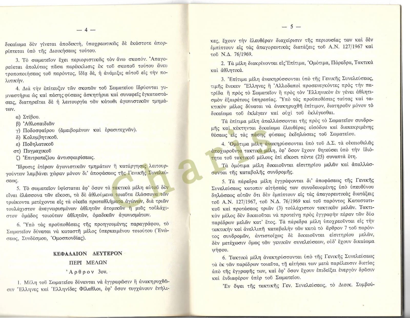 Και πάμε στο Καταστατικό του 1970. Επί Χούντας δηλαδή… Τι γράφει… Ότι απαγορεύεται η εμπλοκή στην πολιτική. Και πολύ καλά κάνει… Γιατί επιτρεπόταν πουθενά και με οποιοδήποτε δημοκρατικό τρόπο η εμπλοκή των πολιτών στην πολιτική, την επταετία;