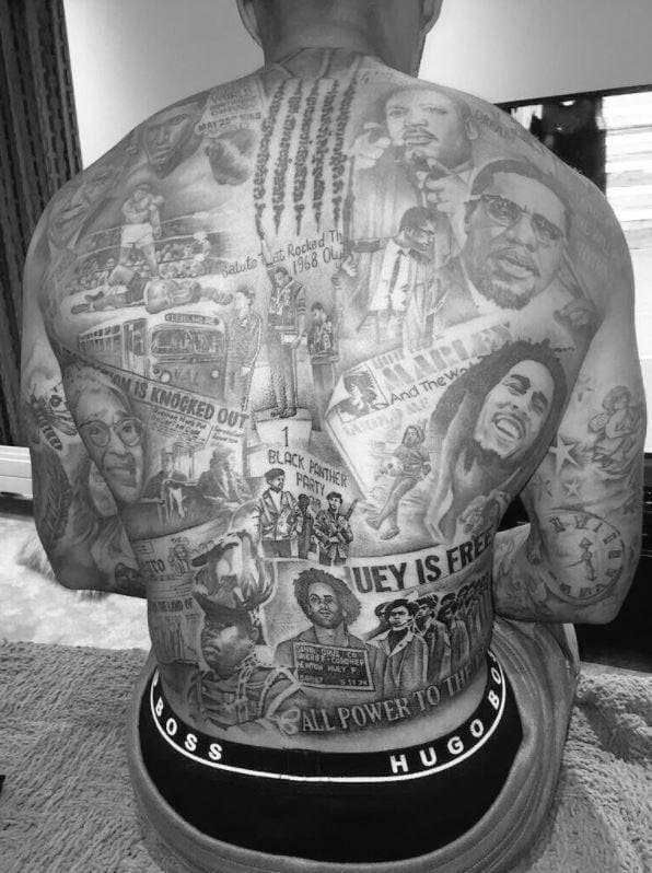 Πρέπει να πέρασε απίστευτο πόνο, για να το φτιάξει όλο αυτό. Ωστόσο, εκτός ότι αυτό που υπάρχει πλέον στην πλάτη του είναι έργο τέχνης, πρόκειται και για έναν πίνακα ιστορίας, μία αφήγηση για το μαύρο κίνημα. Ολοι οι μεγάλοι ήρωες και «επαναστάτες απεικονίζονται στο πίσω μέρος του σώματος του Αντρέ Γκρέι, με τον 26χρονο επιθετικό της Γουότφορντ να δηλώνει υπερήφανος για όσους πάλεψαν για τη βελτίωση της ζωής των μαύρων.