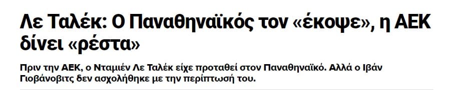 Το θέατρο του παραλόγου ζούμε στην ΑΕΚ. Διαβάζουμε ότι ο Λε Ταλέκ που έχουν πέσει στα πόδια του (κυριολεκτικά…) από την ΑΕΚ… κινδυνεύει να μην έρθει λόγω συζύγου! Ναι σωστά. Αυτό ακριβώς διαβάσαμε στα ρεπορτάζ… Τώρα πόσο σοβαρή είναι η κατάσταση στην ΑΕΚ με αυτά που διαβάζουμε είναι μια άλλη (ΣΟΒΑΡΗ) ιστορία…