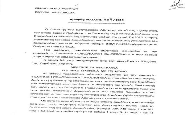 δ) Ξαφνικά, το κείμενο που ουδέποτε ενεκρίθη από το Δ.Σ. της ΕΠΟ, ουδέποτε κατετέθη και ουδέποτε ψηφίστηκε από τη Γ.Σ. της ΕΠΟ, κατατέθηκε στο Ειρηνοδικείο Αθηνών, με πρακτικό υπογεγραμμένο από τον τότε πρόεδρο της ΕΠΟ και του Δ.Σ., κ. Σαρρή (και από άλλα μέλη, τα ονόματά τους θα είναι σίγουρα στη διάθεση εκείνου που θα κάνει την ανάκριση) ως έγκυρο και με γνήσιο πρακτικών πεπραγμένων του Δ.Σ. Με τις προϋποθέσεις αυτές το Ειρηνοδικείο το ενέκρινε.
